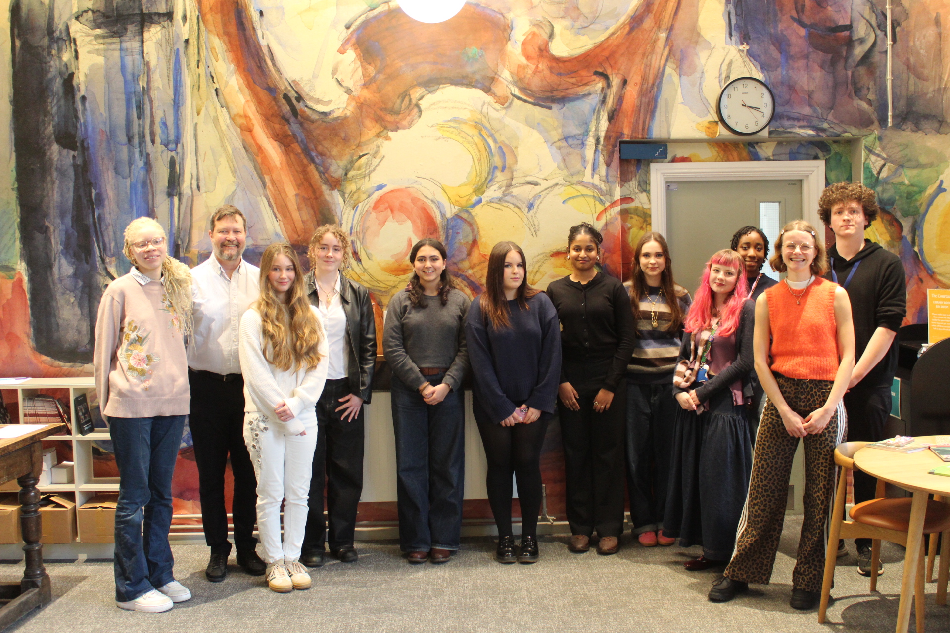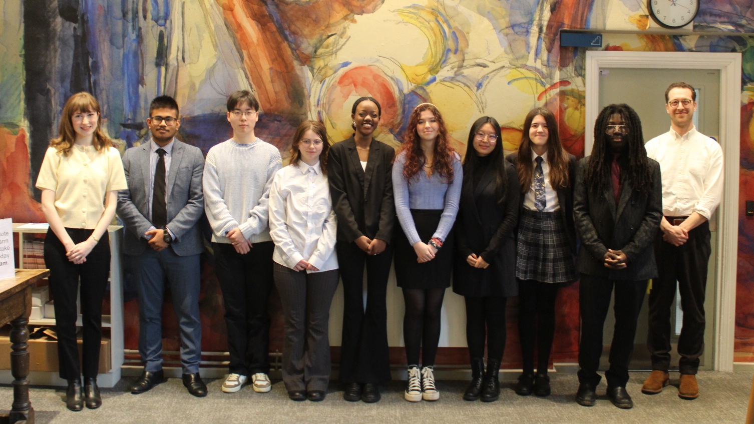 A group of students post for photo in front of a colourful wall