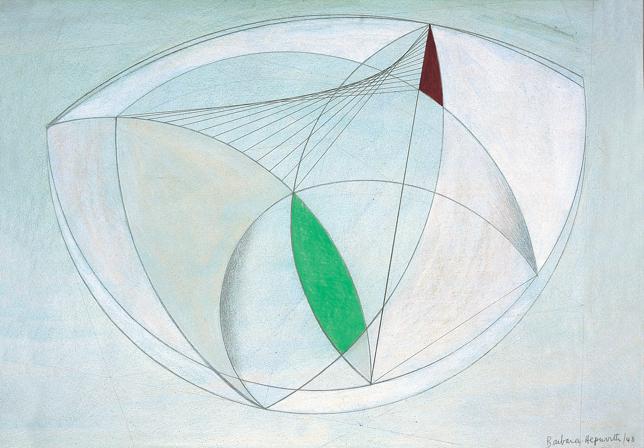 Alongside sculptures, the exhibition features a rich selection of Hepworth’s drawings with colour. Hepworth lacked the materials, studio space and time to produce much sculpture during the first years of the war but her drawings allowed her to continue to explore and develop her ideas. She recalled, ‘In the late evenings, and during the night I did innumerable drawings…exploring the particular tensions and relationships of form and colour which were to occupy me in sculpture during the later years of the war.’ These drawings, usually entitled ‘drawing for sculpture’ are striking for their intricate crystalline forms, punctuated with strong blues, greens, reds and yellows.