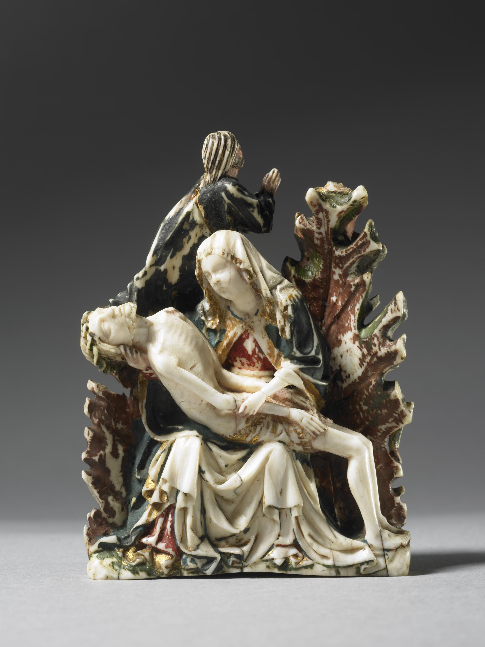 In a drawer in the stores of the British Museum’s Department of Britain, Europe, and Prehistory lies a tiny ivory carving rarely seen by the public. Small enough to be held in the palm of the hand, it is double-sided, displaying two intricately carved scenes from the Passion narrative: the Agony in the Garden of Gethsemane and the Pietà. The entire object is richly polychromed with details picked out in gilding, and four small holes are carved into the semicircular base.