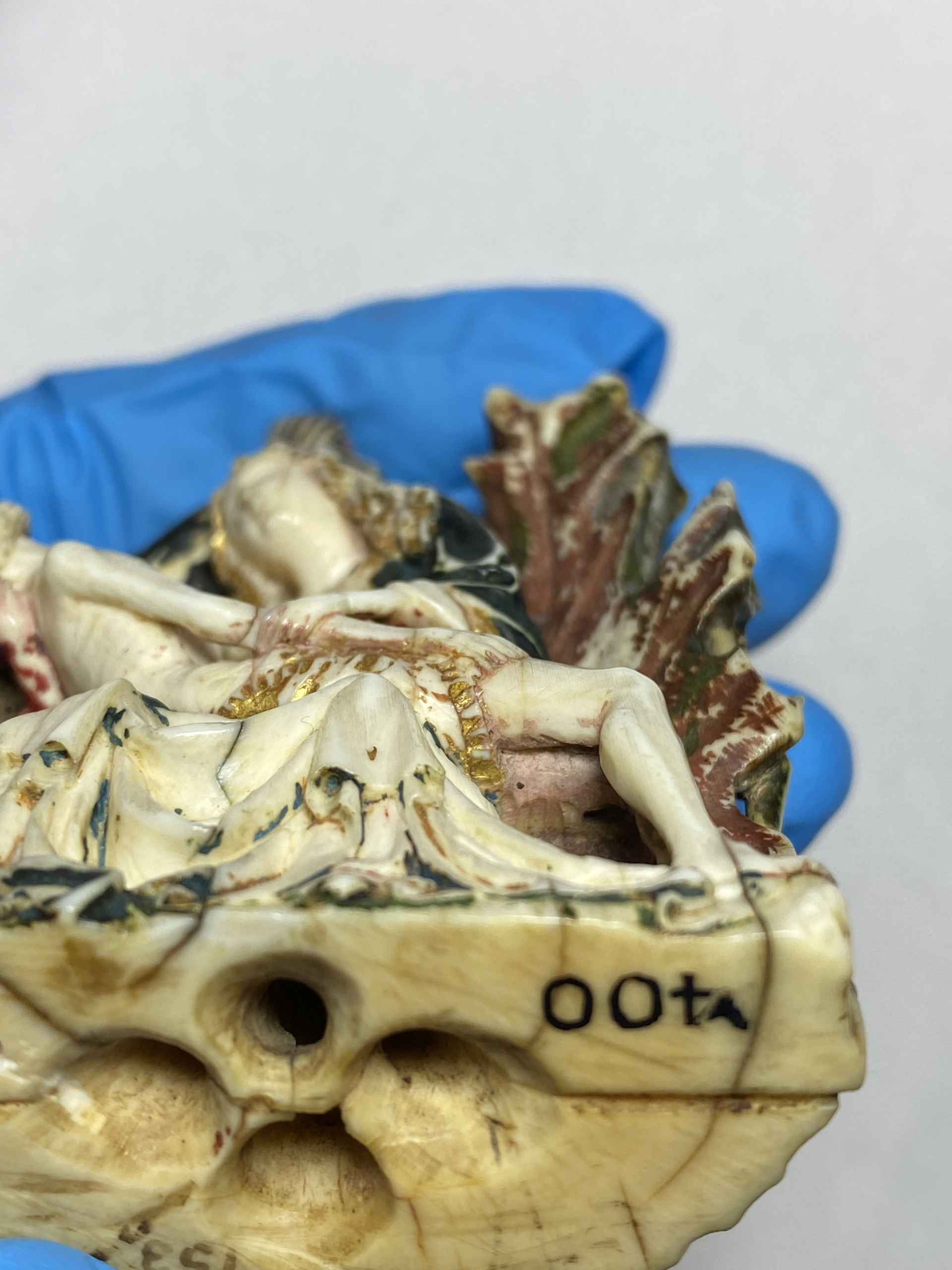 a hand wearing blue gloves holds a small piece of sculpted ivory with polychromy and gilding.