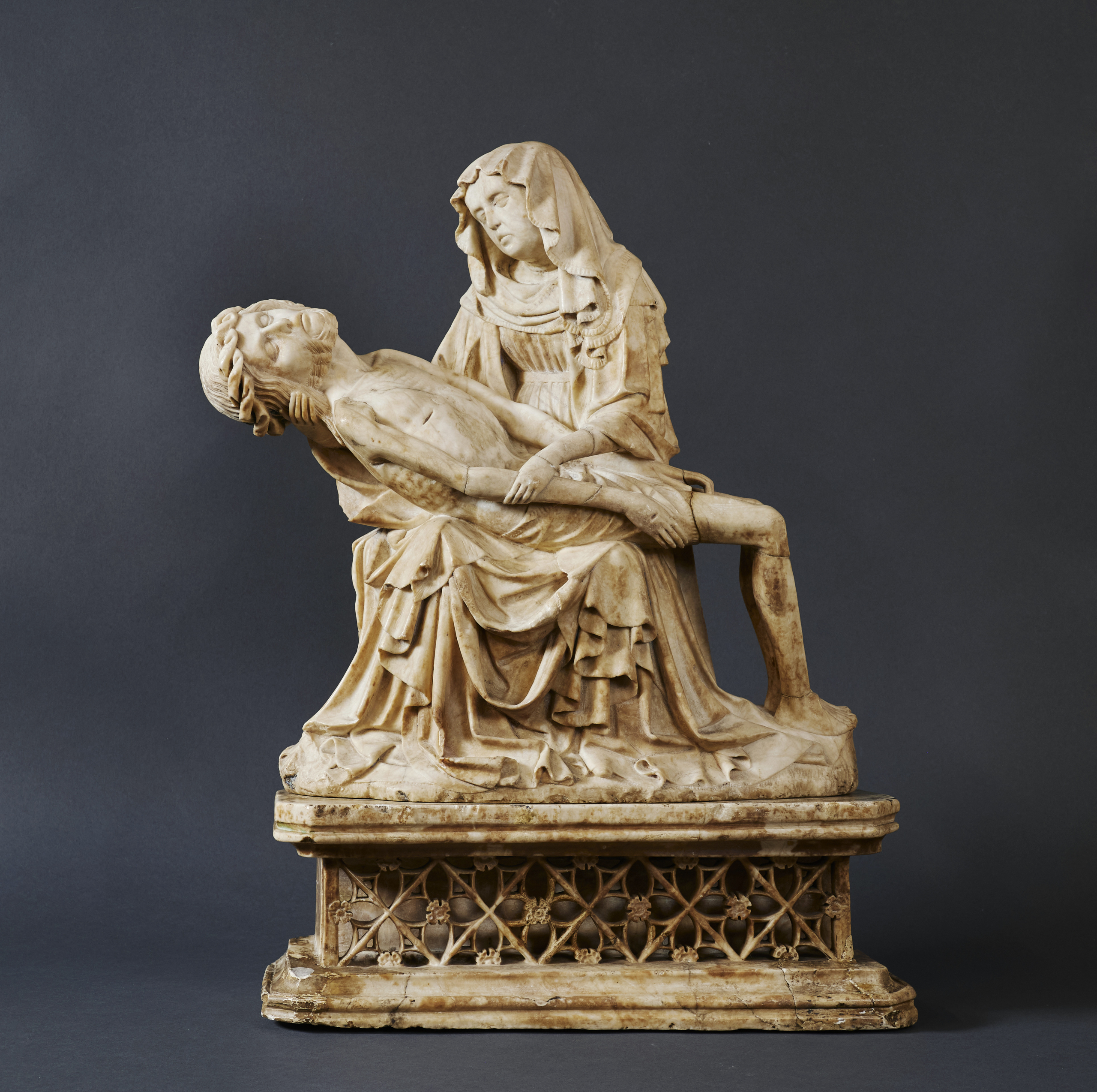 Numerous alabaster Pietàs have been attributed to the Rimini circle. Although the group displays differences in technical execution, the style, composition, and scale (40 to 60 centimetres high) are broadly consistent—as pictured in Swarzenski’s publication (Fig. 7).49 In all models, the dead Christ lies with his head to the Virgin’s right, his body supported by her knees from which drapery falls in U-shaped folds. The round-faced Virgins all wear ridged veils with crimped borders and capacious robes, and in every group Christ’s crown of thorns is rendered as a stylised twisted band. Emotional intensity is a common feature, with consistent emphasis on the contrast between the youthful Virgin and the emaciated, rigid body of her son. This repetition reflects the popularity of the model and its efficacy in stimulating contemplation. However, the slight variations of detail in each Pietà, relating largely to the angle of Christ’s body and the positioning of the hands, show that these carvings were not produced by rote.50