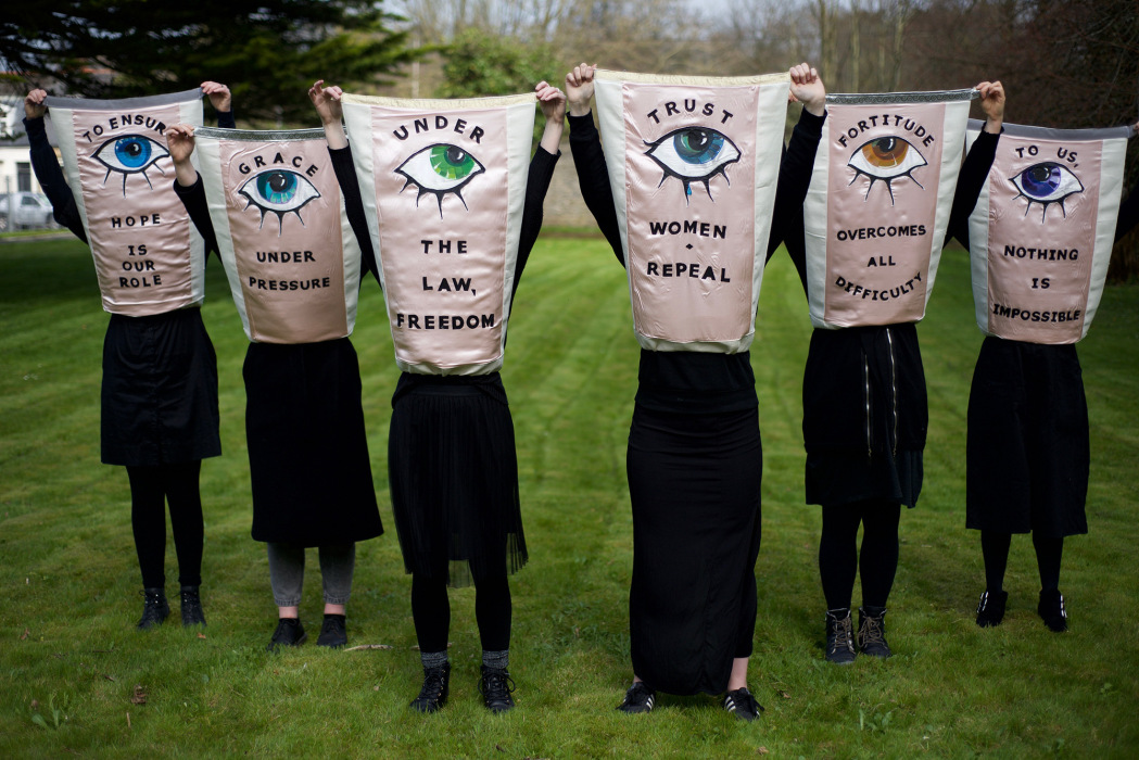 Judah goes on to demonstrate the transformative potential of loss. In response to attacks on women’s reproductive rights, artists transmute their pain into political change. Paula Rego’s Abortion series is cited as a ‘contributing factor’ to Portugal legalising abortion in 2007.4 The collective actions of Ireland’s Artists’ Campaign to Repeal the Eighth Amendment are presented as evidence-collecting, rage-inducing catalysts for change. For example, in Rachel Fallon’s site-specific protest performance, The Aprons of Power (Fig. 1, 2018), white domestic aprons are lifted to reveal hidden pink, fleshy undersides. The work bears witness to the missing mothers incarcerated in Ireland’s Magdalene Laundries, radically placing them into the public realm and connecting past with present.