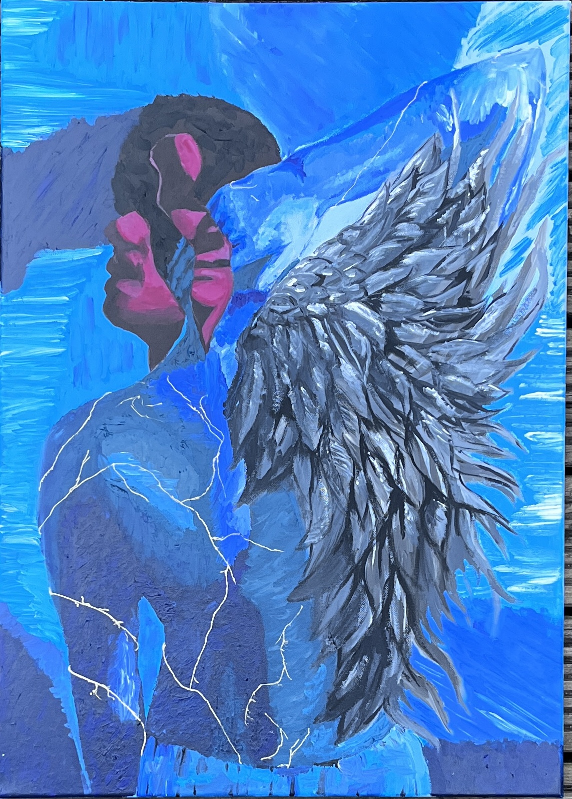 Using myself as the subject I try to embody the themes of Van Gogh’s Self-Portrait within this piece: personal struggles fought internally, physically manifested as fragmented pieces of my face emphasised by the change in texture. The rest of the piece has symbolic meaning: the wing to represent one’s own ambition, the multiple faces representing personalities, and the kintsugi lines drawn from Japanese art to show inspiration.