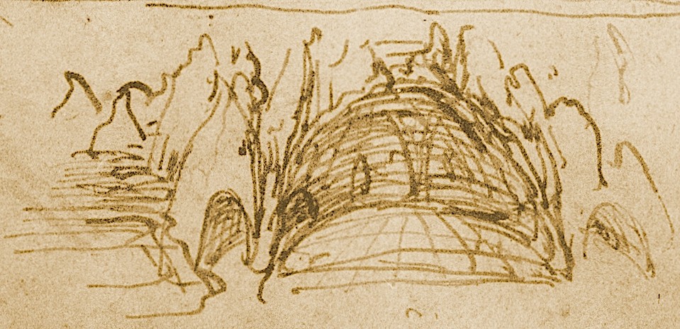 “And drawn by my eager desire, desirous of seeing the great confusion of the various and strange forms created by ingenious nature, having wandered for some distance among the overhanging rocks, I came to the mouth of a huge cavern, before which for a time I remained stupefied, having been ignorant of its existence…” British Library, Codex Arundel, c. 155r)